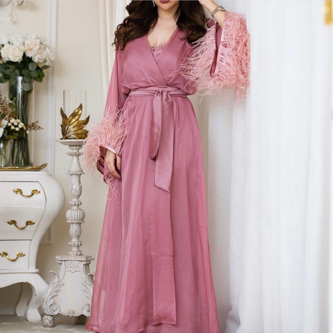 روب شيفون مزين بالريش مع القطعه الداخليه من الحرير بكسرات عالصدر