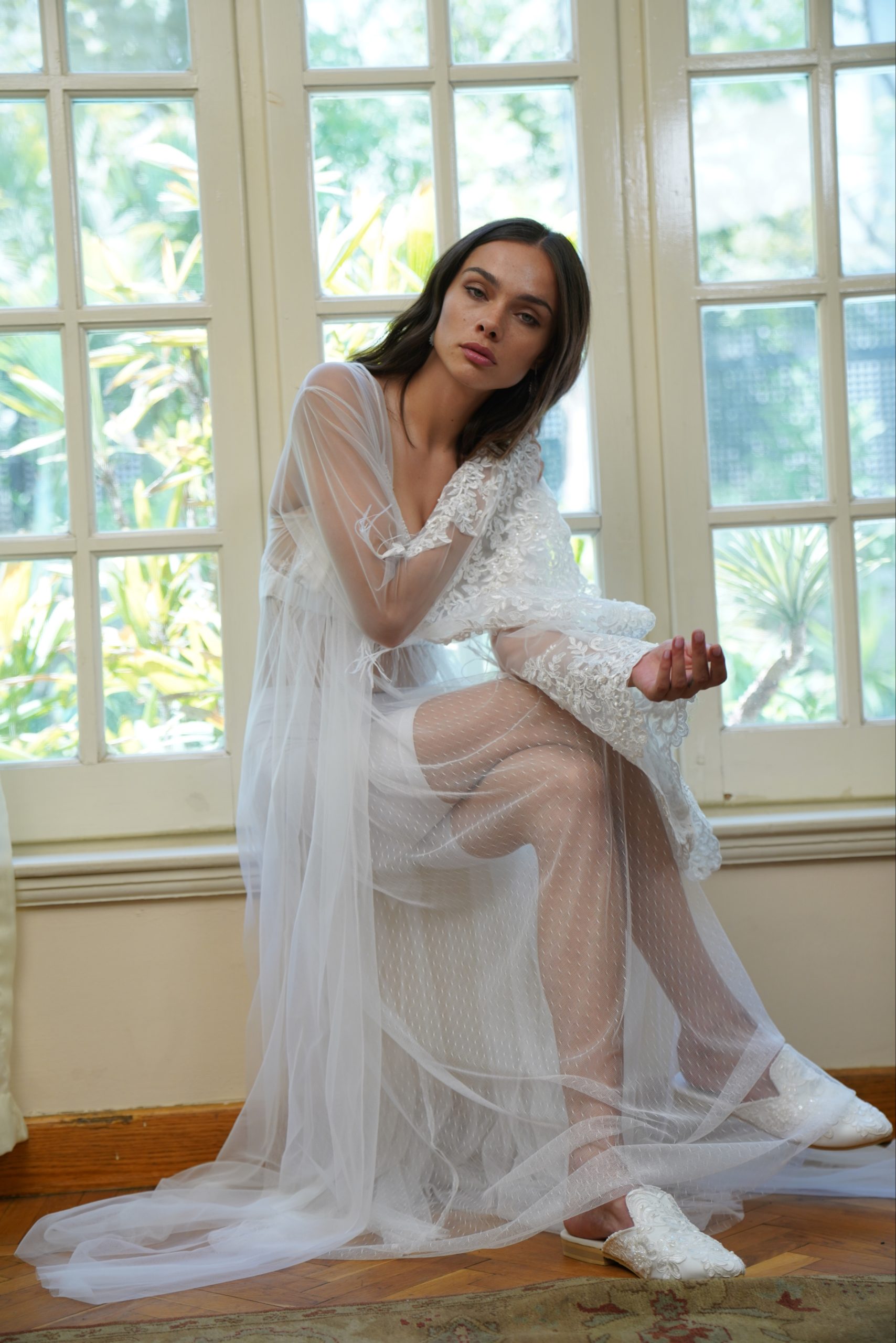 روب مع القطعه الداخليه من التور المنقط الرقيق مبطن بالحرير فقط من ناحيه الصدر ثم قصه كلوش غير مبطنه وغير شامل الشورت الداخلي قطعه للعرايس مزينه بالدانتيل المشكوك والريش